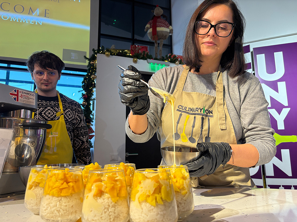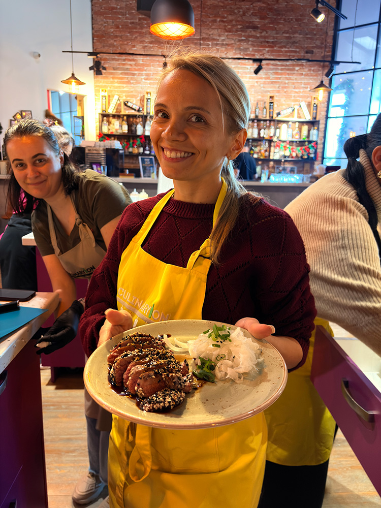 Împărțiți în echipe, colegii au trebuit să asculte invitațiile chef-ului CulinaryOn, să respecte pașii rețetelor și să gătească trei preparate delicioase: piept de rață tataki cu salată daikon – un tip de ridiche albă gustoasă, somon teriyaki cu orez și, la desert, orez cu lapte, iasomie și mango.