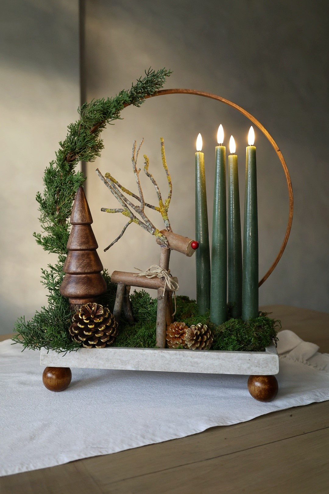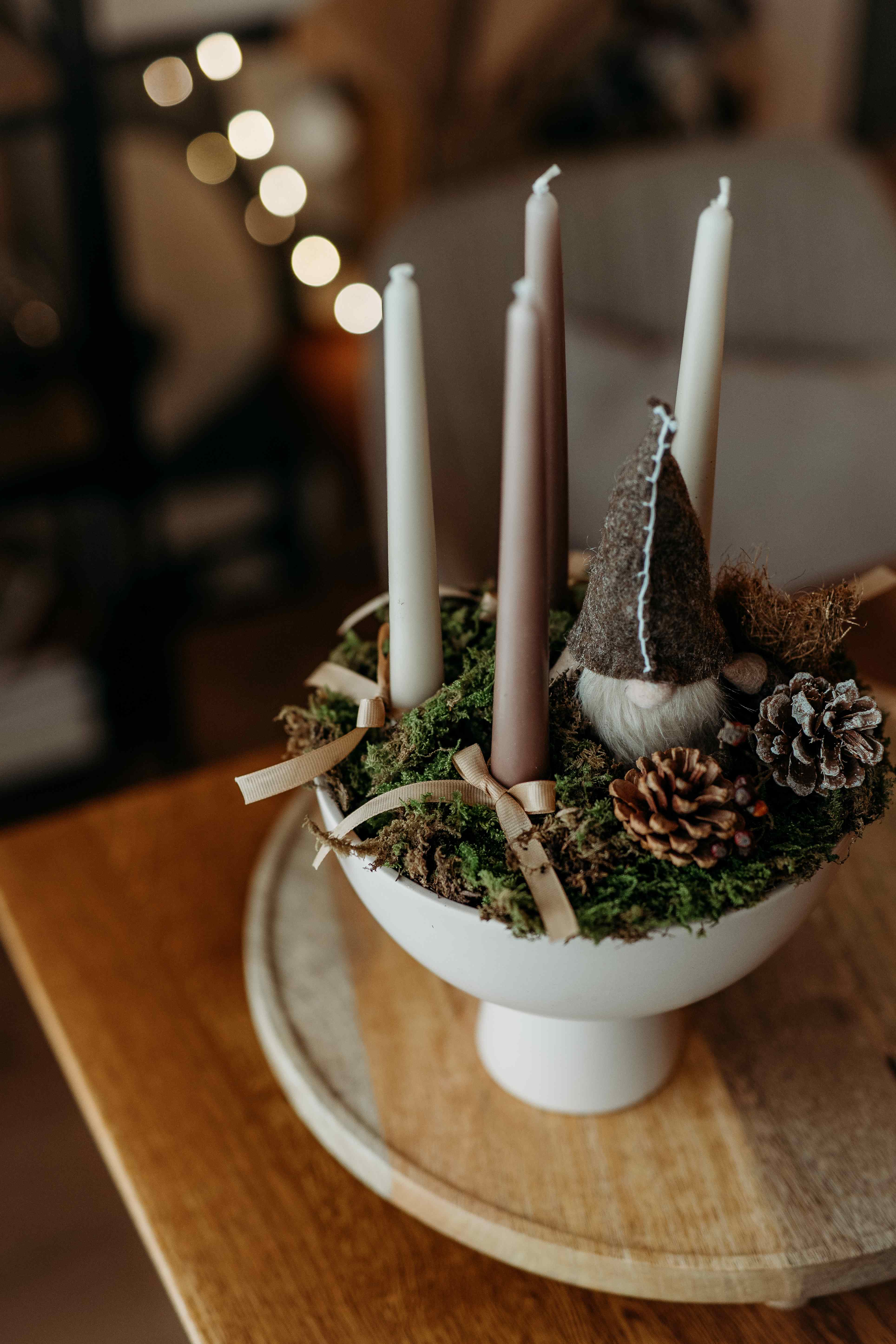 - Postavite bazu – kao temelj dekoracije odaberite okrugli ili pravokutni ukrasni pladanj i svijeće.
